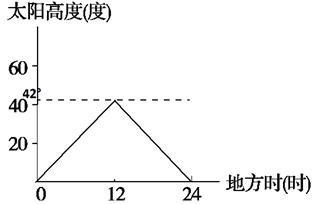 (5)对跖点(也称对趾点)是地球同一直径的两个端点。二者的经度相差180°;纬度值相等,而南北半球相反。故Q点的对趾点为69°S,75°E;此日Q地对跖点的太阳高度随时间变化的情况为该地刚好出现极昼,0点钟日出,0点钟日落,12点正午太阳高度为42度。据此画出图即可。
