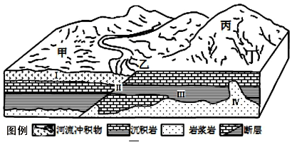 【小题2】由图示可知,I处为河流冲积平原,属于外力作用;II处为断层构造,由内力作用形成;III处为沉积岩,由外力作用形成;IV处为岩浆岩,由岩浆活动形成,属于内力作用。