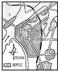 1、综合题 读某城市(盛行风为东北风与西南风)示意图,回答问题。