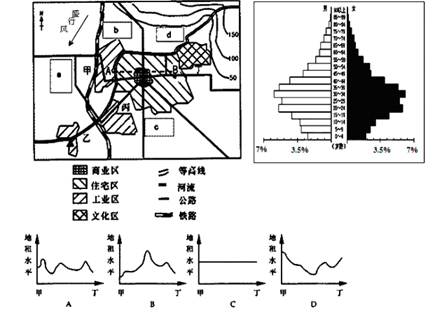 小题1:图中能正确表示沿A——B的虚线地租水平变化特征是________图 小题2:假如你是房地产开发商,将在该城市的a、b、c、d、四个地块中选择一处建造高级住宅区,你认为最合适的地块是__________,并简要说明你选择的理由_________________。 小题3:根据该城市近期统计的人口年龄构成金字塔图,分析该城市发展的人口优势,并预测30年后,该城市面临的人口问题。