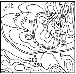 【小题1】根据等高线弯曲方向与河流流向相反,等高线向右弯曲,则河流自b流向a,再根据指向标可判断河流流向是由东北向西南。所以B正确。