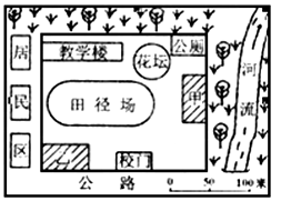 【小题2】图中有比例尺,比例尺等于图上距离/实地距离,可以算出教学楼的长度为100米。