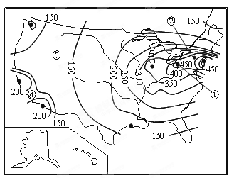 2、单选题 人口潜力指数是指目前人口状况下各地区能够继续容纳人口的潜力大小。读美国人口潜力指数分布示意图。据图回答题。