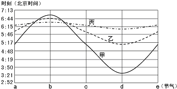 A.北京>①>② B.②>①>北京 C.①>②=北京 D.①<②=北京 参考答案: 本题解析: 本题难度:一般 5、单选题 该图为“我国甲、乙、丙三地某年内的日出时刻变化曲线图”,图中的a、b、c、d、e为节气。读图,回答问题。 |