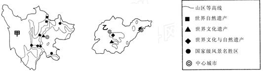 材料一?下图为我国甲、乙两省的重点旅游资源分布图。