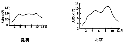 1、单选题 下图是北京、昆明两地的旅客流量统计示意图,读图判断1—2题。