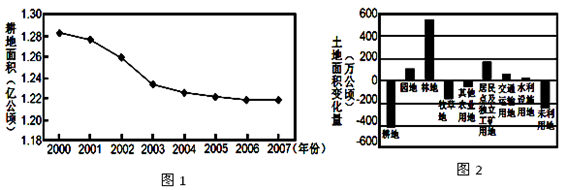 (1)由图1中信息判断,2000年~2007年耕地面积不断减少,所以A选项是错误的;2000年~2007年耕地面积在2003年后小于1.24亿公顷,所以B选项是错误的;2003年~2007年各年耕地面积减少幅度不可能相同,所以D选项是错误的;答案应选C。