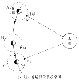 2、综合题 读日、月、地运行关系示意图,回答下列问题。