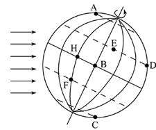 (3)图中各点中,与D自转线速度相同的是 点、 点;与C点地方时相同的是 点;与B点昼夜长短相同的点是 点;出现极昼现象是 点;正午太阳高度最大的是 点。