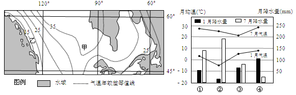 【小题2】乙地位于北纬45度到60度之间大陆西岸,受西风带控制而形成温带海洋性气候,具有终年温和湿润的特征。右图中①夏季高温多雨、冬季温和少雨,为亚热带季风气候;②夏季高温多雨、冬季寒冷干燥,为温带季风气候;③终年温和湿润,为温带海洋性气候;④夏季炎热干燥、冬季温和多雨,为地中海气候。