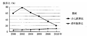 小题2:由图中可以知道,从2006-2008年之间开始为人口红利期,说明有劳动能力的所点比例还有比较大,没有出现“用工荒”,故A错误;少儿扶养比从2002年开始逐年下降,说明出生率不断减少,而老年扶养比一直在上升,说明老龄化在不断上升,故D错误。而C项在题目中没有体现出来。正确答案是B。