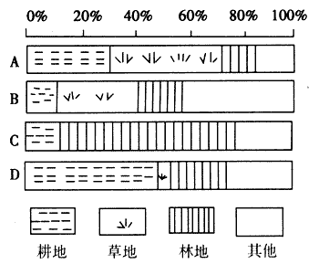 2、综合题 下图为中国、印度、日本、英国四国的土地资源构成图。读图,回答下列问题。