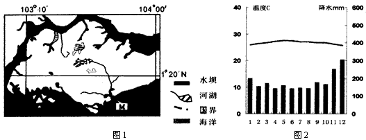 ? 某岛国人口约500万(2009年),经济发达,淡水资源严重不足。该国国土面积约640万平方千米,其中生态面积约500万平方千米,地形单调,中间阶段不足15米。岛上河流最长不足16千米。图1示意该国全岛信其附近地区,图2为对应的气候资料。