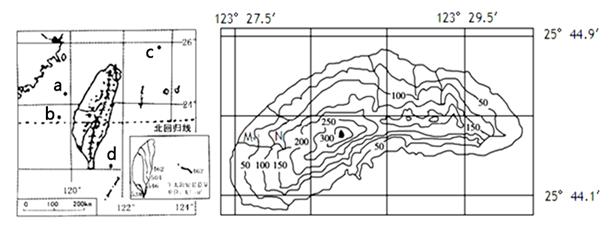 点评:本题组借助等高线分布图考查学生对等高线示意图的判读能力,难度较小。解答本题组的关键是:(1)根据等高线稀疏来判断坡度陡缓。(2)根据钓鱼岛南北所跨纬度估算钓鱼岛南北两端的距离。