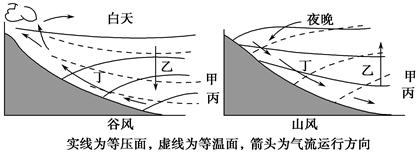 本题解析:山谷风是学习热力环流知识时常涉及的内容,解答本题组前可以先绘制出山谷风的形成过程示意图(如右图),并添上等温面。如下左图,表示白天,吹谷风,丙处表示的等压面应向上弯曲,乙、丁两处风向是正确的,甲处表示的等温面向下弯曲,对照题图可知只有等压面向下弯曲是错误的。如果表示夜间,参见下右图,吹山风,丙处等压面向下弯曲,表示低压,甲处表示的等温面向上弯曲,与题图正好相反,乙、丁两处气流方向也与题图中相反,题干中说只有一处正确,则丙处等压面向下弯曲是正确的,地理兴趣小组观测的时间最有可能为夜间。