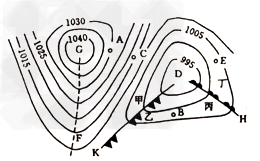 (1)写出图中气压场名称和天气特点:G?,? D?,?。 (2)在图中画出A、B两地的风向。 (3)图中甲、乙、丙、丁四处,? 、______将要发生(或正在发生)天气变化,一般情况下?____、?_____有阴雨现象。