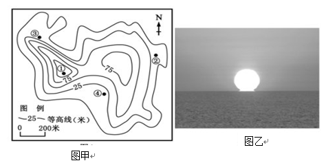 【小题2】图乙是一幅日出或者日落的图片,结合图甲,在④处东面有一山脊阻挡,不可能看到水上日出,西面是大海,没有阻挡,所以是日落景观。A、C错。北半球夏半年日落西北方向,但从④处看,正西、西北方向有山脊阻挡,所以此时的日落方向只能是西南方向。冬半年,日落西南,日落时间在18点之前,所以B对。D错。