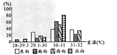3、单选题 某中学地理兴趣小组对北京市某住宅区夏季室内(未使用空调)与室外气温进行测量,测量期间室外平均气温为29.3℃。下图表示测量期间四种朝向房间不同室温段的比例构成,其中横坐标表示不同室温段,纵坐标表示室温平均值处在相应温度段内的房间数占测试房间总数的百分比。读图回答1—3题。