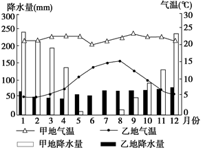 试题分析: 甲地月均温都在15°C以上,应为热带气候类型;降水季节分配不均,10月至次年4月降水多,5月至9月降水少,为南半球的热带草原气候,对应的地区是巴西高原。
