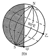 5、综合题 图 8 为太阳光照图,斜线(阴影)部分表示夜半球,空白部分表示昼半球,读后完成下列要求(每空1分,共 15分)