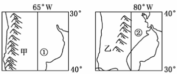 小题1:甲山为安第斯山,乙山为阿巴拉契亚山,甲山以东主要为亚热带湿润气候,河流汛期在南半球夏季(11月一次年2月)。
