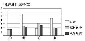 小题1:读图可知,生产成本=电费+原材料运费+成品运费。计算比较可知③地成本最低,因此应布局在③地。