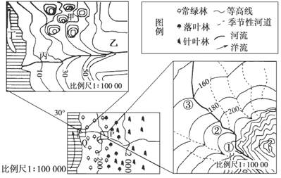 4、单选题  下图为某地区自然景观分布示意图,以及P、Q两区域的等高线图,读图完成下列问题。