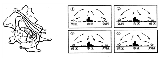 【小题1】城市热岛效应主要是指城市地区的气温相对周围地区较高,主要与城市的下垫面硬化面积大,植被覆盖率低有关,城市的尘埃多,排放的温室气体多,排放的废热多,都使得城市比周围地区温度高。城市建筑物多,建筑高大,不能降低风速,还可加强楼间的风速。选B正确。