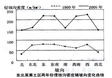 1.两个年份该区域各坡向侵蚀沟密度2.侵蚀沟密度表现为南坡大于北坡的自然原因是