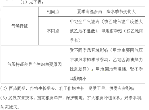 本题解析:本题考查世界区域地理和资料综合分析能力。(1)图示甲位于印度半岛,受热带季风气候影响,终年高温,降水集中于夏季;乙地位于我国南方地区,受亚热带季风气候影响,夏季高温多雨,冬季低温少雨;比较说明即可。(2)对农业的影响应从有利和不利两方面分析,乙地的亚热带季风气候,雨热同期,夏季高温多雨,利于农业生产,但降水量的季节、年际变化大,故旱涝灾害多发。(3)提高粮食产量主要从提高单产和耕地面积的保障两方面分析。