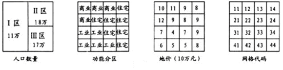 1、单选题 GIS技术对商业网点的选址具有明显的作用。下图表示某城市三个行政区(I、Ⅱ、Ⅲ区)人口数量、功能分区和地价分布图。同一行政区内每一方格之间,若功能相同,人口数量相等;若功能不同,依商业、住宅、工业人口数量按3:5:2比例而定。读图完成下列各题。?