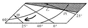 5、单选题 下图是世界某区域的经纬网图(箭头为地球自转方向,阴影为黑夜,此时在丙地正好可以看到日出的景观),读图回答下列各题。