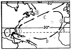 2、综合题 读“大西洋部分洋流分布图”回答问题。