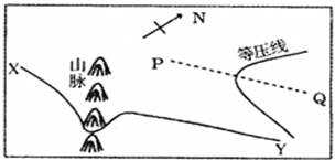 小题1:从山脉海拔高自转线速度大可知图中自转线速度分布为自北向南递减,为南半球;PQ锋面位于气旋左侧为冷锋,南半球冷锋降水水在冷气团一侧,雨区位于PQ东南侧,D对。