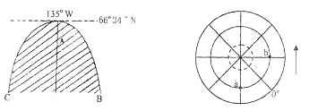 A.2010年10月1日11时8分45秒 B.2010年9月30日22时59分57秒 C.2010年10月1日10时59分57秒 D.2010年9月30日23时8分45秒 参考答案: 本题解析:本题考查地球运动。 本题难度:一般 2、综合题 读图完成。 参考答案:小题1:略 本题解析:左图中的弧CAB晨昏线于北极圈相切,所以可以判断该图为北半球夏至日6月22日的光照图,太阳直射点的纬度为23°26′N。图中135°W为夜半球的中央经线地方时为0:00.此时地方时为12:00的经线是与135°W相对的经线即45°E。北京时间是120°E的地方时,就可以推算。夏至日地球公转到远日点附近,公转速度较慢。最短航线的问题:a,b两地位于同一纬度并且是b在东方,根据自转方向是逆时针所以此图为北半球,所以俩点间的最短航线是经过北极附近的。 本题难度:一般 3、单选题 在大洋西岸的某村镇(60°W,36 |