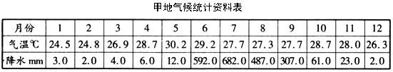 2、综合题 下图为某地区等高线地形图,下表为图中甲地气候资料,据图表回答下列问题。
