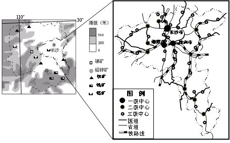 (1)由图可以看出:长株潭城市群体系的城市等级由三级构成;一级城市只有3个,二级城市有9个,三级城市数量最多。城市的分布主要在交通沿线和河流沿岸;多分布在海拔200米以下的平原地区。