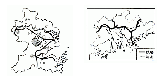 5、综合题 图中两幅图分别是我国长江三角洲和珠江三角洲经济区示意图,读后回答(14分)