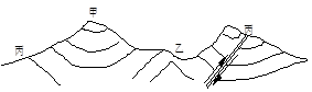 下降岩块(地堑)成谷地或低地(渭河平原、汾河谷地)。图示甲处的地质构造:中间岩层向下凹,判断为向斜,中间地势高,四周低,判断为山岭。所以本题选择B选项。