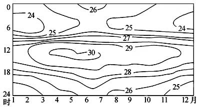 A.地势低,云量多 B.地势高,空气稀薄 C.纬度高,太阳高度小 D.受副热带高气压控制 2、综合题 读图,完成下列要求。(14分) 3、单选题 下图为某地一年中气温日变化的分布图(单位:℃)。读图回答下列各题。 |