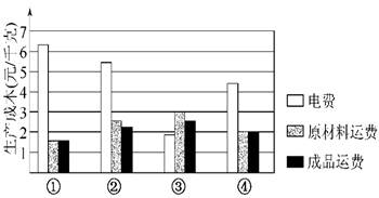 5、单选题 国外一公司打算在我国某地开办一生产企业,他们在①②③④四地进行了选址考察,制作了一幅四地生产成本柱状图。读图回答下列各题。