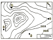3、单选题 登山队员准备在图示地区宿营,为避免突发的山洪,在①②③④四地中,最不适宜宿营的地点是 (?)