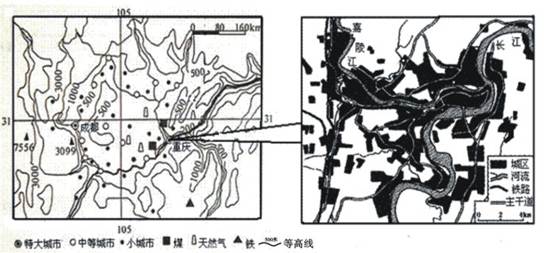 5、综合题 下图为成渝经济区等高线地形图、气候图和重庆城市分布示意图。结合材料回答下列问题(12分)