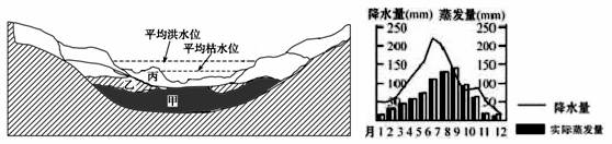 小题2:根据该河段气候图可以得到:降水量较大,集中在7、8月份,只有8、9月份的实际蒸发量与降水量相差较小,其它月份都是降水量大于实际蒸发量。永久性高山冰川积雪融水补给的河流主要分布在降水较少的高山地区,该地区降水量相对较多,故A错。季节性积雪融水补给主要补给时间是春季,而此图中河流的主要补给季节为夏季,故B错。地下水补给的河流比较普遍,而且对河流径流量影响较小,而河流某河段地形剖面图中,可以看到平均枯水位和平均洪水位相差较大,故主要补给不是地下水补给,故D错。该地区总体降水量较多,且集中在夏季,大部分时间降水量大于实际蒸发量,故应为雨水补给。故C正确。