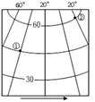 2.②点的经纬度为60°N,20°E,位于①的东北方向。