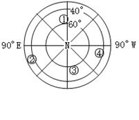 小题1: 图示以北极点为中心的北半球图,根据各地经纬度位置,可以判断①位于欧洲②位于亚洲,④位于北美洲,由题意选B。
