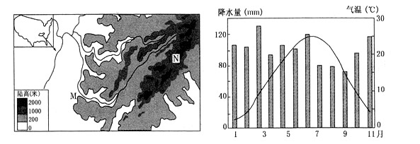 2、综合题  下左图是某国局部地形图,下右图是N地的气候资料图,读后回答下列问题