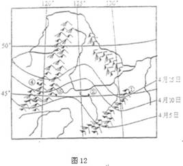 小题1:根据等值线的分布,③的积雪融化时间为4月5日---4月10日;④的积雪融化时间为4月10日---4月15日,故两地积雪融化时间相差0—10天。