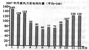 小题1:由图中2007年丹麦所有风力发电机组一年中风力发电量的变化可以看出,夏季相对发电量小,冬季发电量大一些,主要是太阳直射点的南北移动导致风力大小的变化造成的。