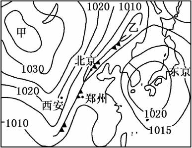 本题解析:图中显示甲处为鬲压中心,乙处为低压中心,甲处的气压值在1 035~1 040百帕之间,乙处的气压值在1 000~1005百帕之间,由此可推知两地之间的气压差值;从等压线分布的疏密分析北京与东京的风力大小;图中显示出了锋面气旋系统,郑州与西安分别位于冷锋锋面的两侧,分别受不同性质的气团控制。